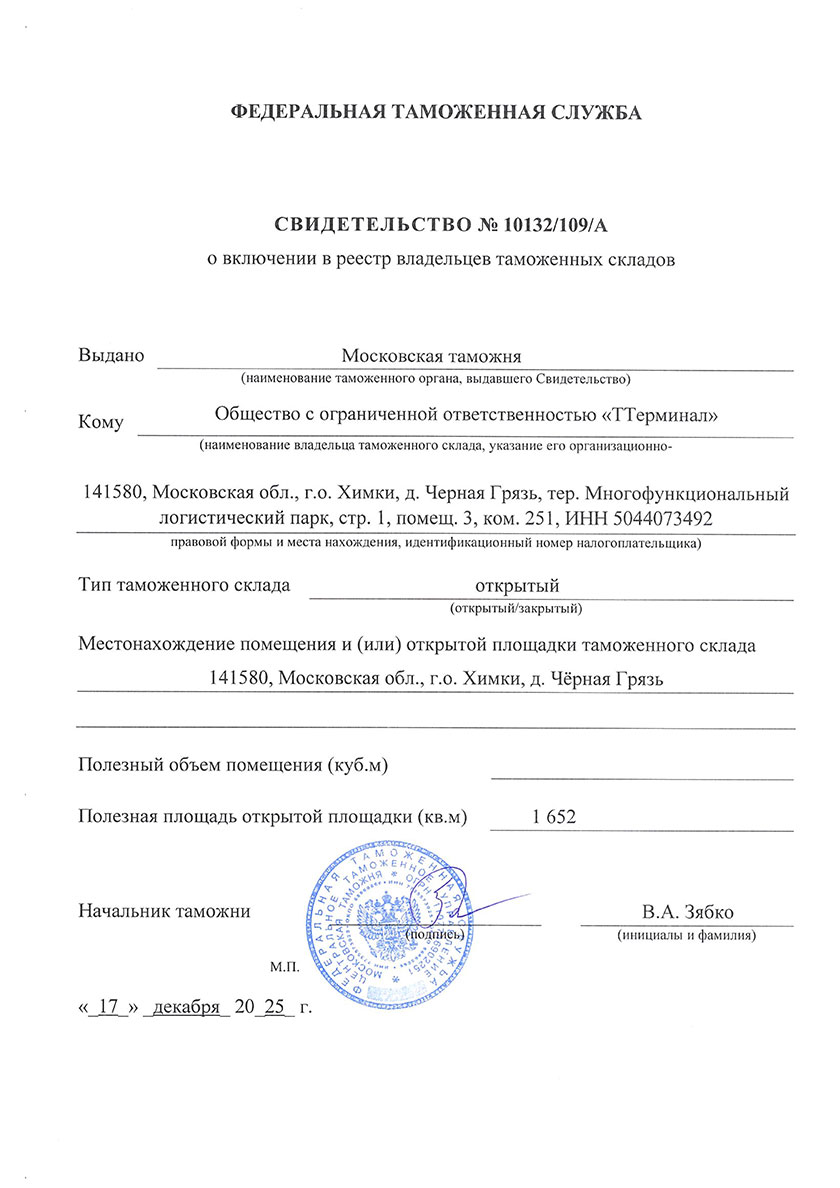 № свидетельств о включении в реестр владельцев таможенных складов – 10132/051/Г, 10132/109А